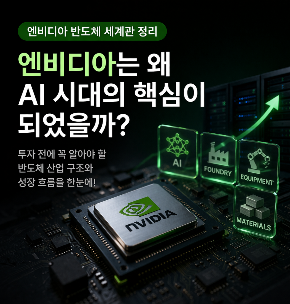 반도체 산업은 설계, 생산, 장비, 소재 등 다양한 기업이 연결된 구조입니다. 이 가운데 엔비디아가 주목받는 이유는 AI 연산 시장을 사실상 지배하고 있기 때문입니다.